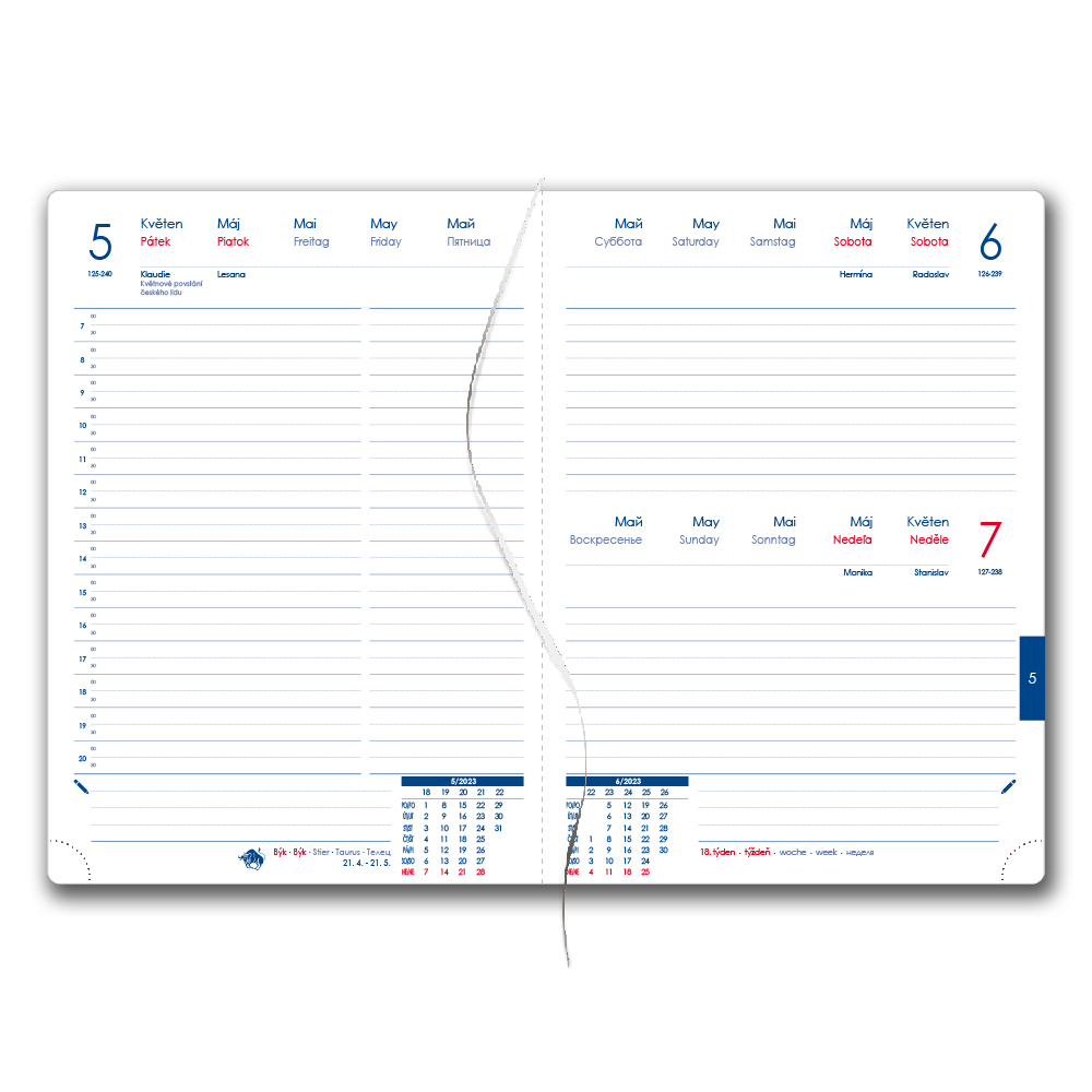 Diár obsahuje: okrúhle odtrhávcie rožky, bielu záložku,