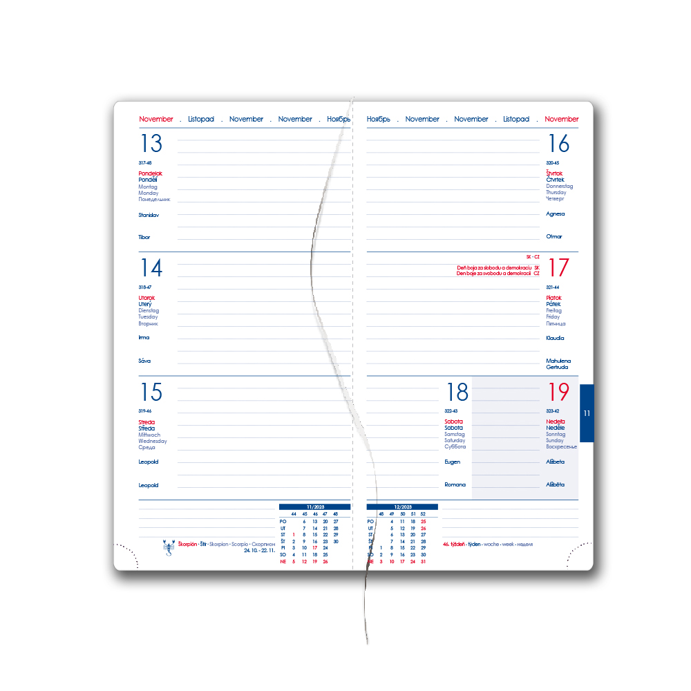 Diár obsahuje: okrúhle odtrhávacie rožky, bielu záložku,