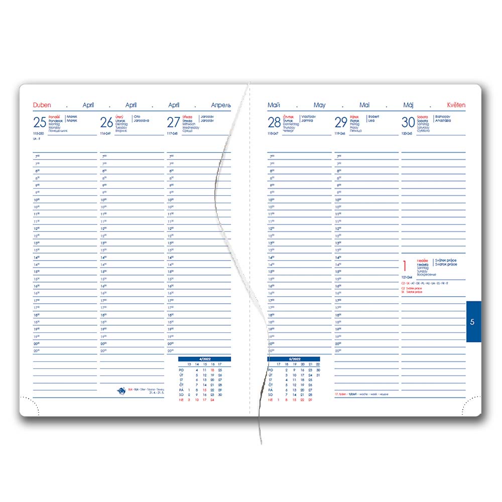 Formát: A5 Rozmer bloku: 143 x 206 mm Rozsah: 142 stran Väzba: šitá V8 (tkaná nit) Kalendárium: týždenné české menné Jazykové mutácie: CZ, SK, EN, DE, RU Farba bloku: biela Farba písma: modrá a červená Diár obsahuje: okrúhle odtrhávacie rožky a