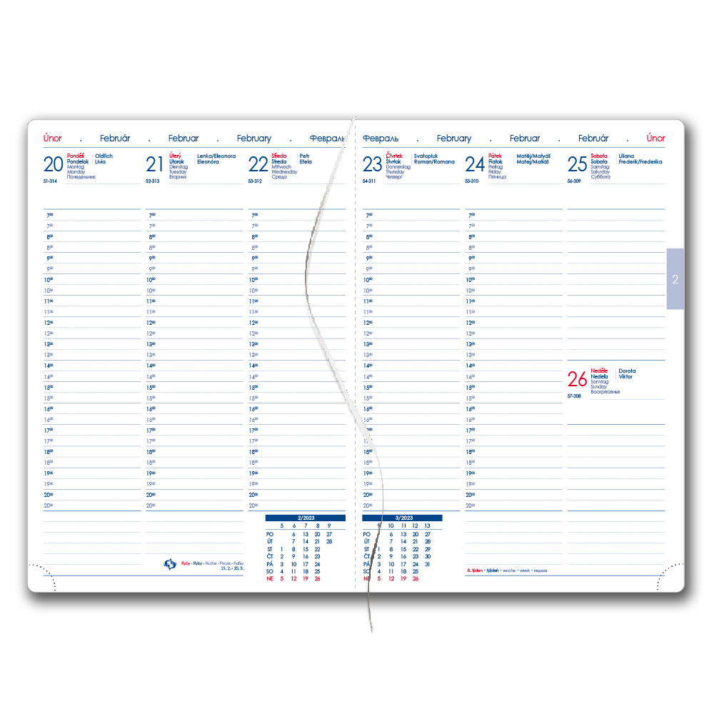 Formát: A5 Rozmer bloku: 143 x 206 mm Rozsah: 142 stran Väzba: šitá V8 (tkaná nit) Kalendárium: týždenné české menné Jazykové mutácie: CZ, SK, EN, DE, RU Farba bloku: biela Farba písma: modrá a červená Diár obsahuje: okrúhle odtrhávacie rožky a