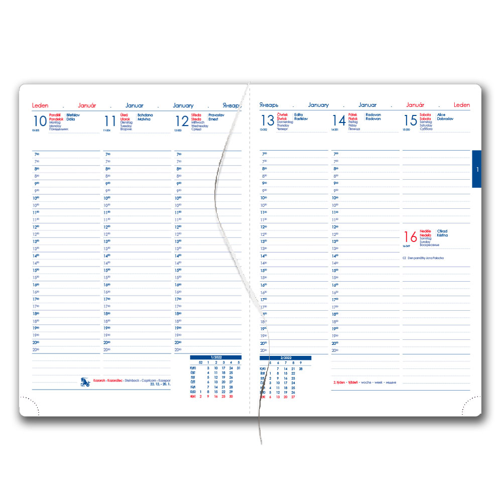 Formát: B6 Rozmer bloku: 120 x 165 mm Rozsah: 144 stran Väzba: šitá V8 (tkaná niť) Kalendárium: týždenné české a slovenské menné Jazyky: CZ, SK, EN, DE, RU Farba bloku: biela Farba písma: modrá a červená Diár obsahuje: okrúhle odtrhávcie rožky, bi