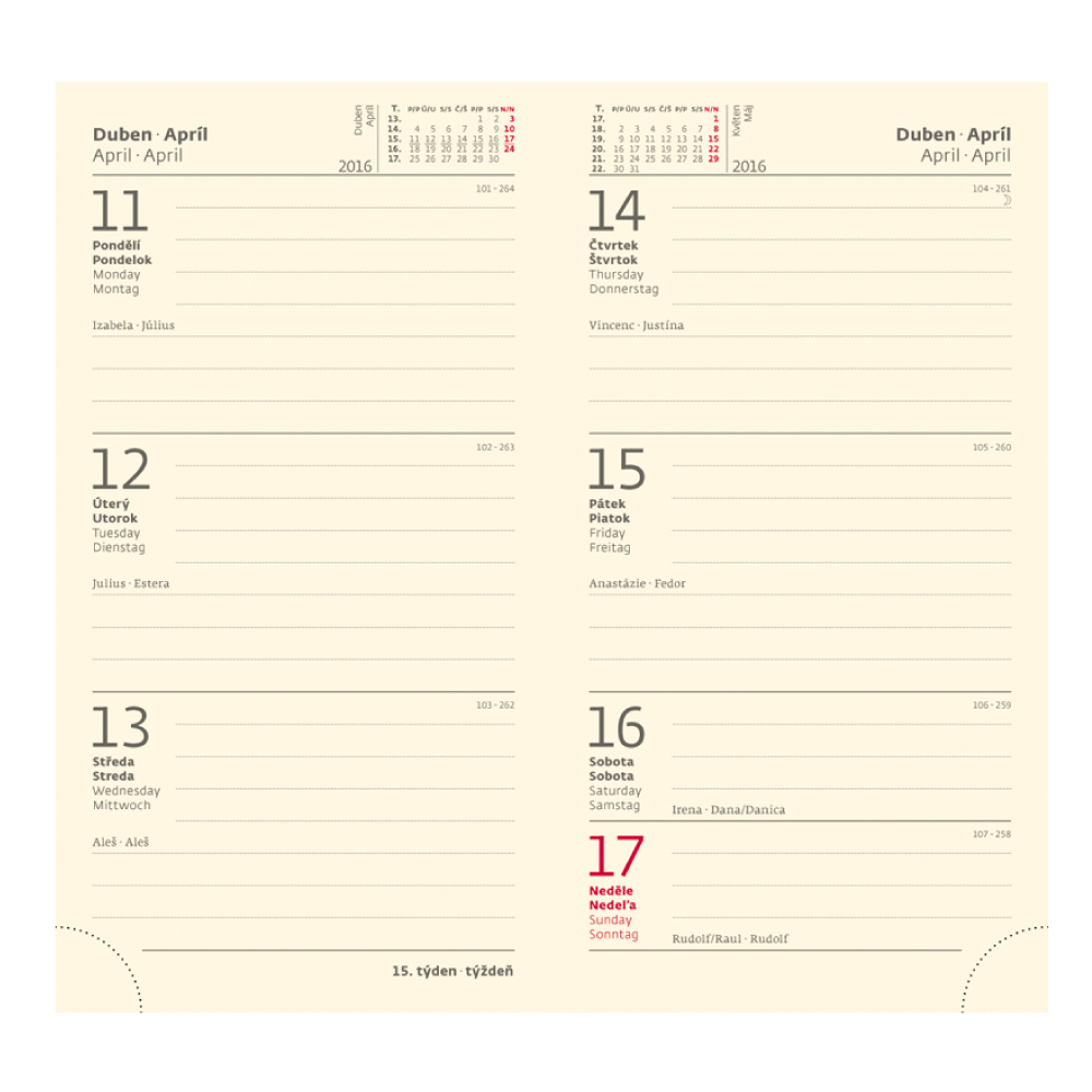 Diár 2016 týždenný vreckový New Praga - modrá rozmer: 80 x 150 mm Počet strán : 128 väzba - šitá V8 Farba bloku - chamois Kalendárium denné Osobné údaje, plánovač dovolenky (mesačný prehľad), plánovací kalendár, medzinárodné sviatky, ročný výhľad, týžd