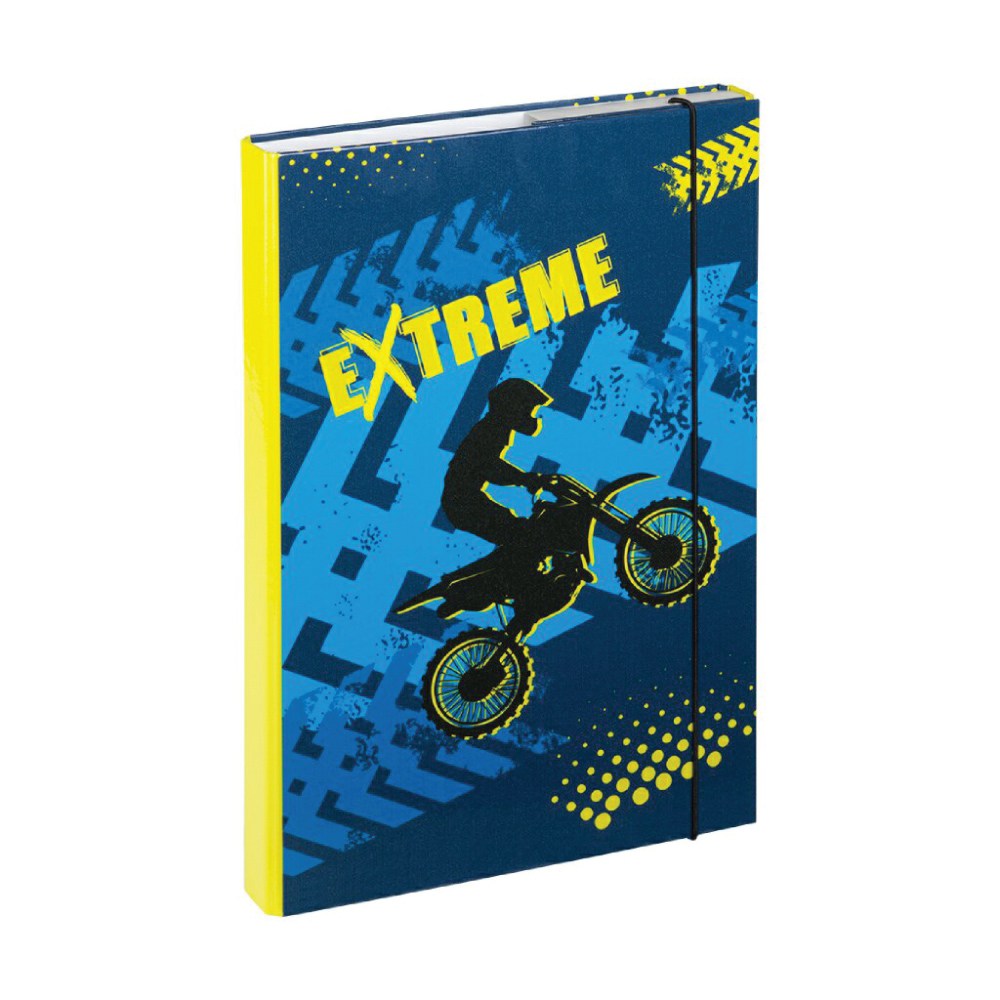 Dosky na školské zošity A4 - extreme Rozmery: na zošity či papiere A4, A5 a menšie Hmotnosť: 300g Popis: dosky na školské zošity A4, ochranné dosky na úschovu zošitov či iných dokumentov, vrátane vnútornej klopy proti vypadnutiu, zaistené gumičk