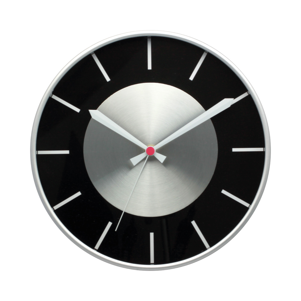 Plastové nástenné hodiny s hliníkovou kruhovou plochou pre laserové gravírovanie.