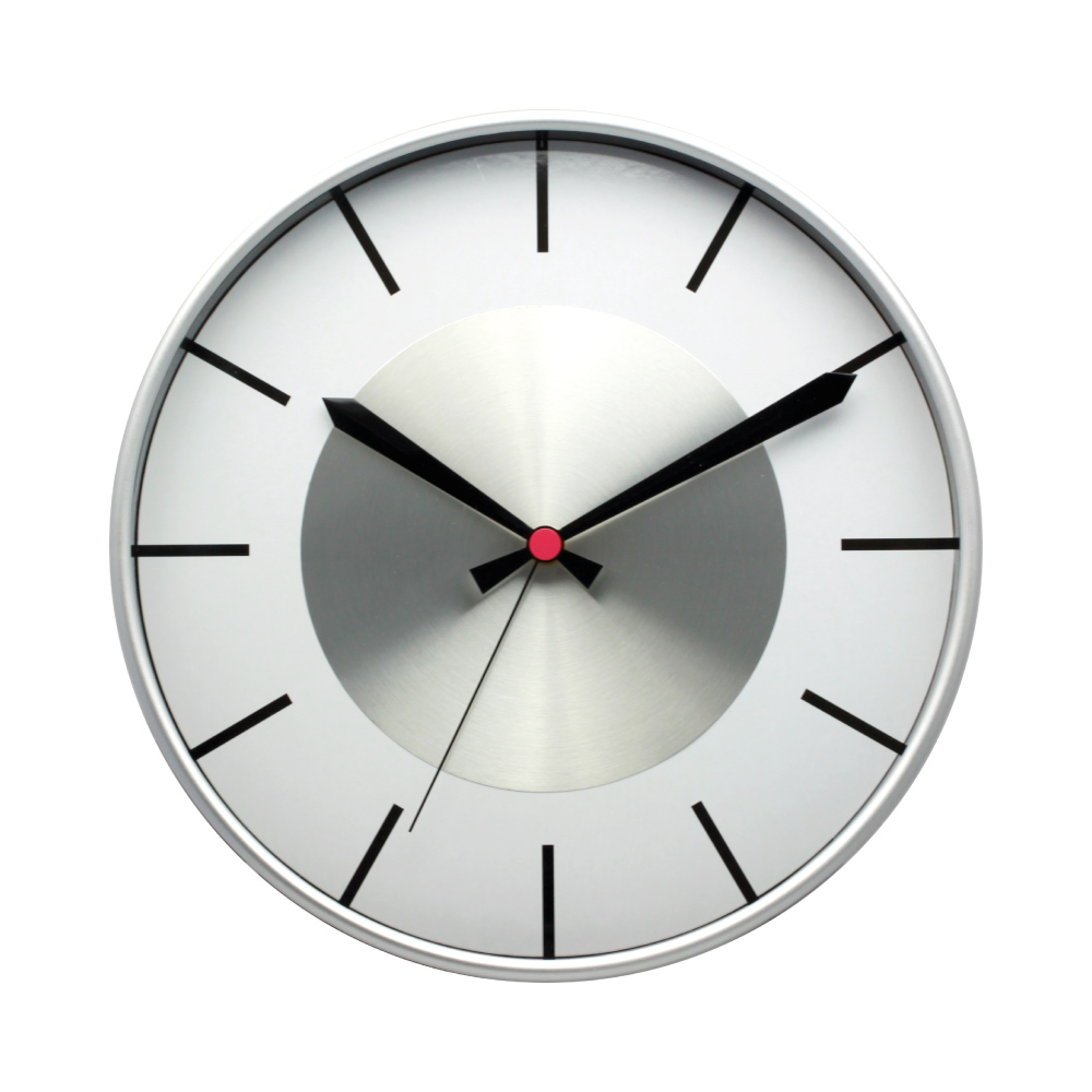 Plastové nástenné hodiny s hliníkovou kruhovou plochou pre laserové gravírovanie.