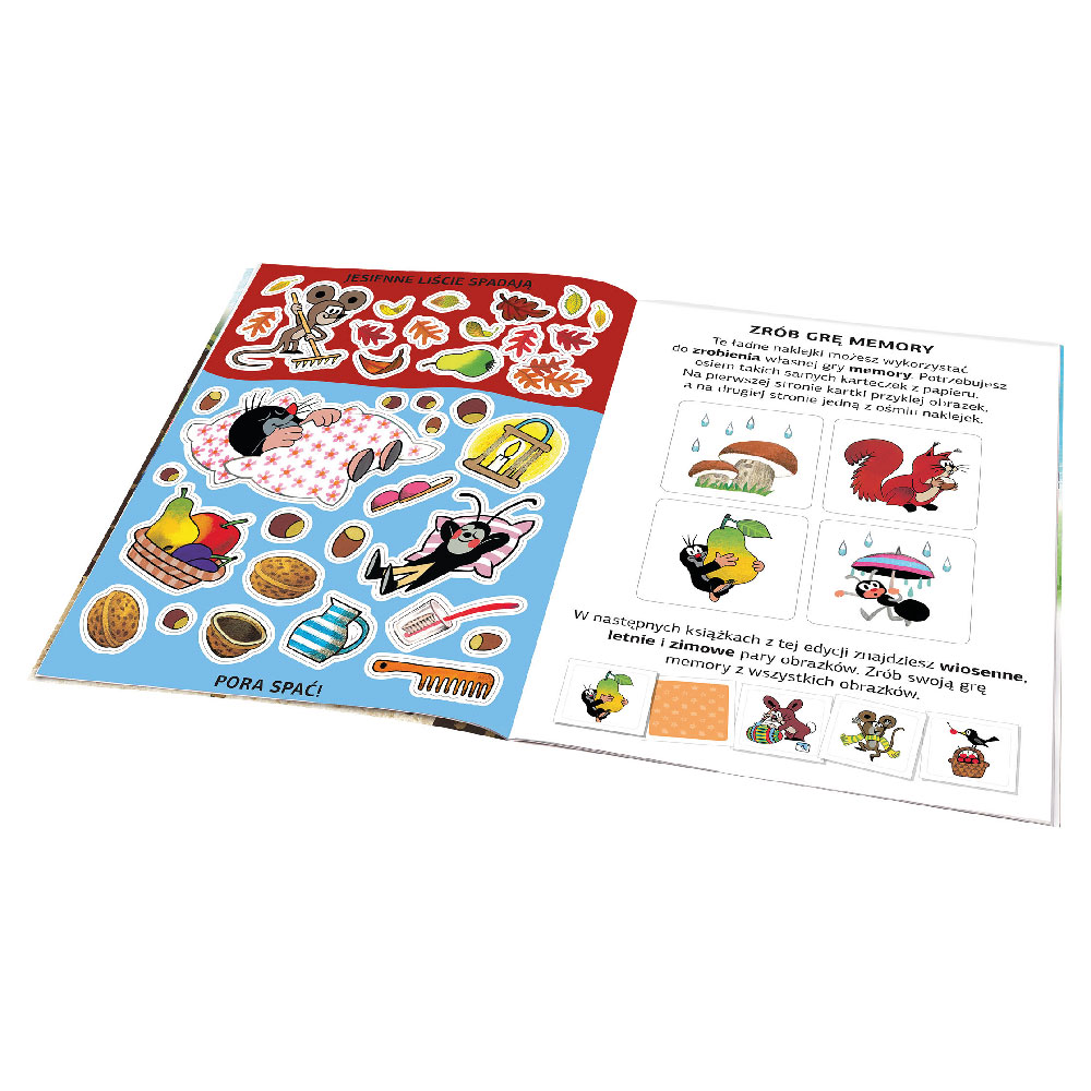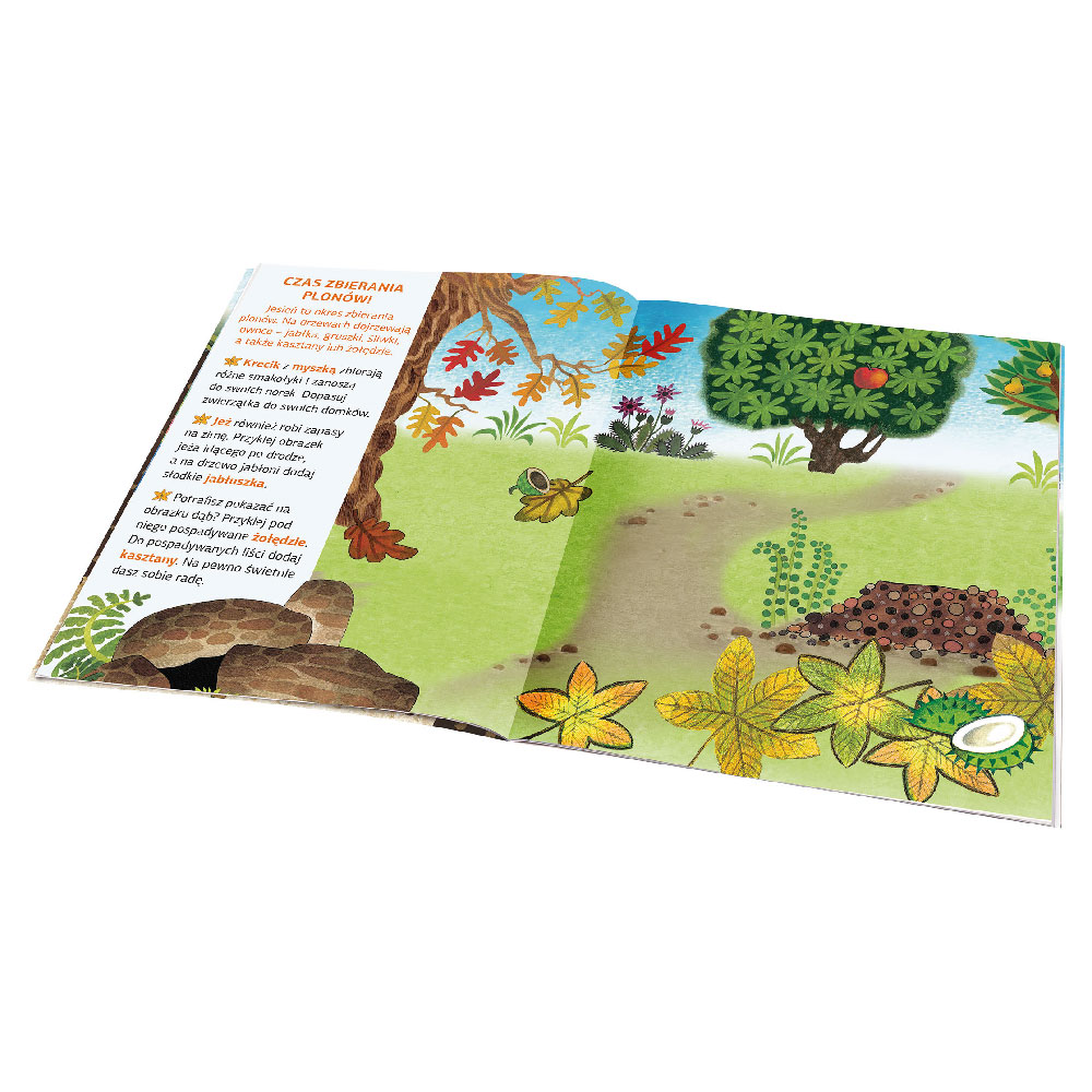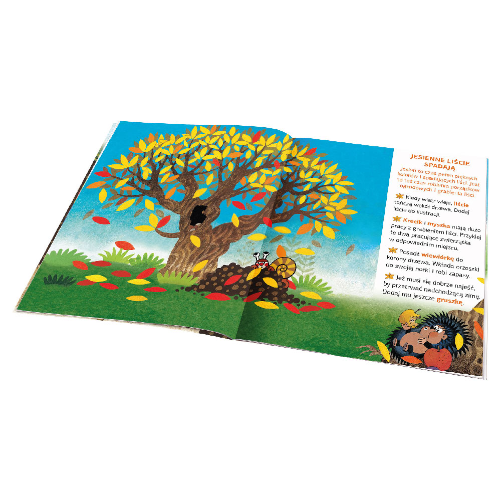 Dvostranske prizore lahko otroci dopolnijo z obilico ljubkih nalepk, bodisi po navodilih bodisi po lastni domišliji. Poleg tega se bodo v knjigi naučili veliko novega in zanimivega o jeseň, z nalepkami pa si lahko okrasijo tudi lastno sliko, sobo ali izdelajo igro spomin!