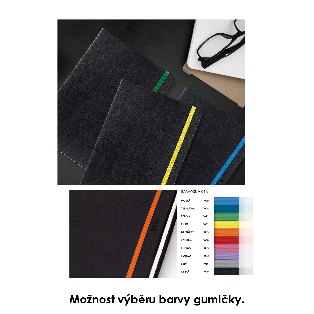 Rozmer: 148 x 210 mm Formát: A5 Kalendárium: české mesačné a týždenné + 9 strán na poznámky Rozsah: 144 strán Papier: biely Materiál dosiek: koženka Hlavný jazyk: český Ďalšie jazyky: SK, EN, DE Na objednávku od 100 ks Infostrany obsahujú: CZ/SK krstné m