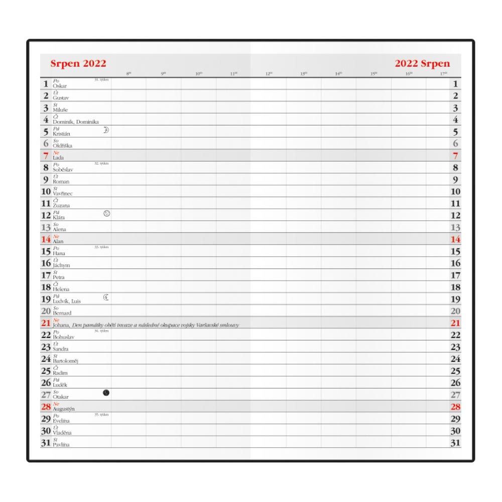 Rozmer: 90 x 170 mm Formát: vreckový Kalendárium: mesačné české menné Poťahový materiál: jemný hladký materiál PVC Papier: biely Počet strán: 32 Väzba: šitá väzba V1 Kalendárium obsahuje: mesačné fázy, ročné obdobia, letný a zimný čas Informa