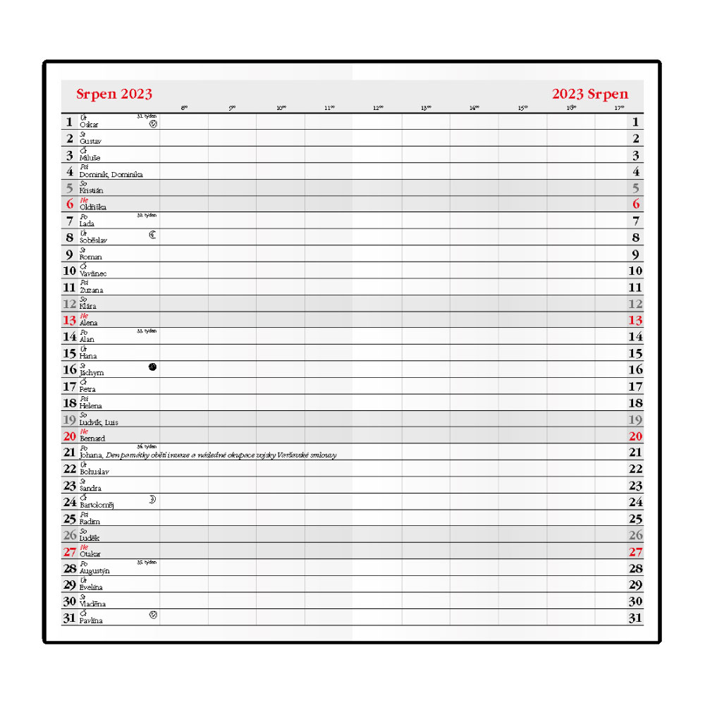 Rozmer: 90 x 170 mm Formát: vreckový Kalendárium: mesačné české menné Poťahový materiál: jemný hladký materiál PVC Papier: biely Počet strán: 32 Väzba: šitá väzba V1 Kalendárium obsahuje: mesačné fázy, ročné obdobia, letný a zimný čas Informa