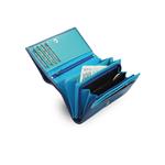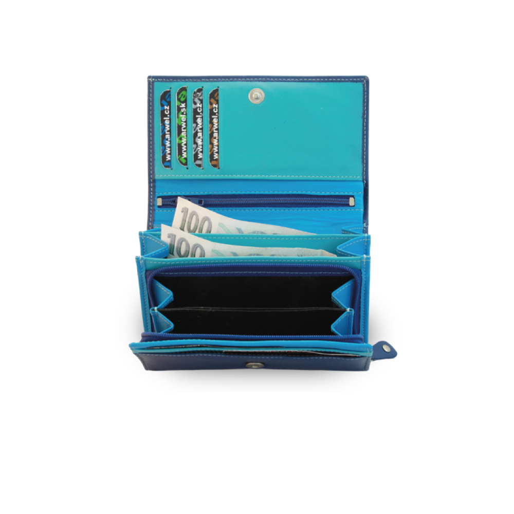 vonkajšia farba modrá, vnútro peňaženky zložené z 3 odtieňov modré,