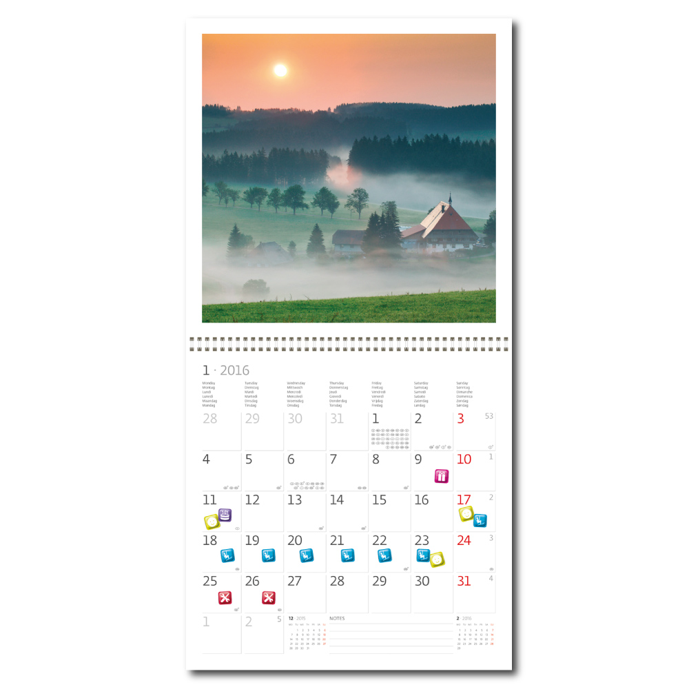 Nástenný kalendár 2016 - Sunset rozmer - 30 x 30 cm (otvorený 30 x 60 cm) kalendárium v 6 jazykoch - GB, D, F, I, NL, DK rozsah kalendára - 12 fotografií s mesačným kalendáriom Twinová väzba, supertuhá lepenka. Viac ako 300 farebných samolepiek. sviatky 3