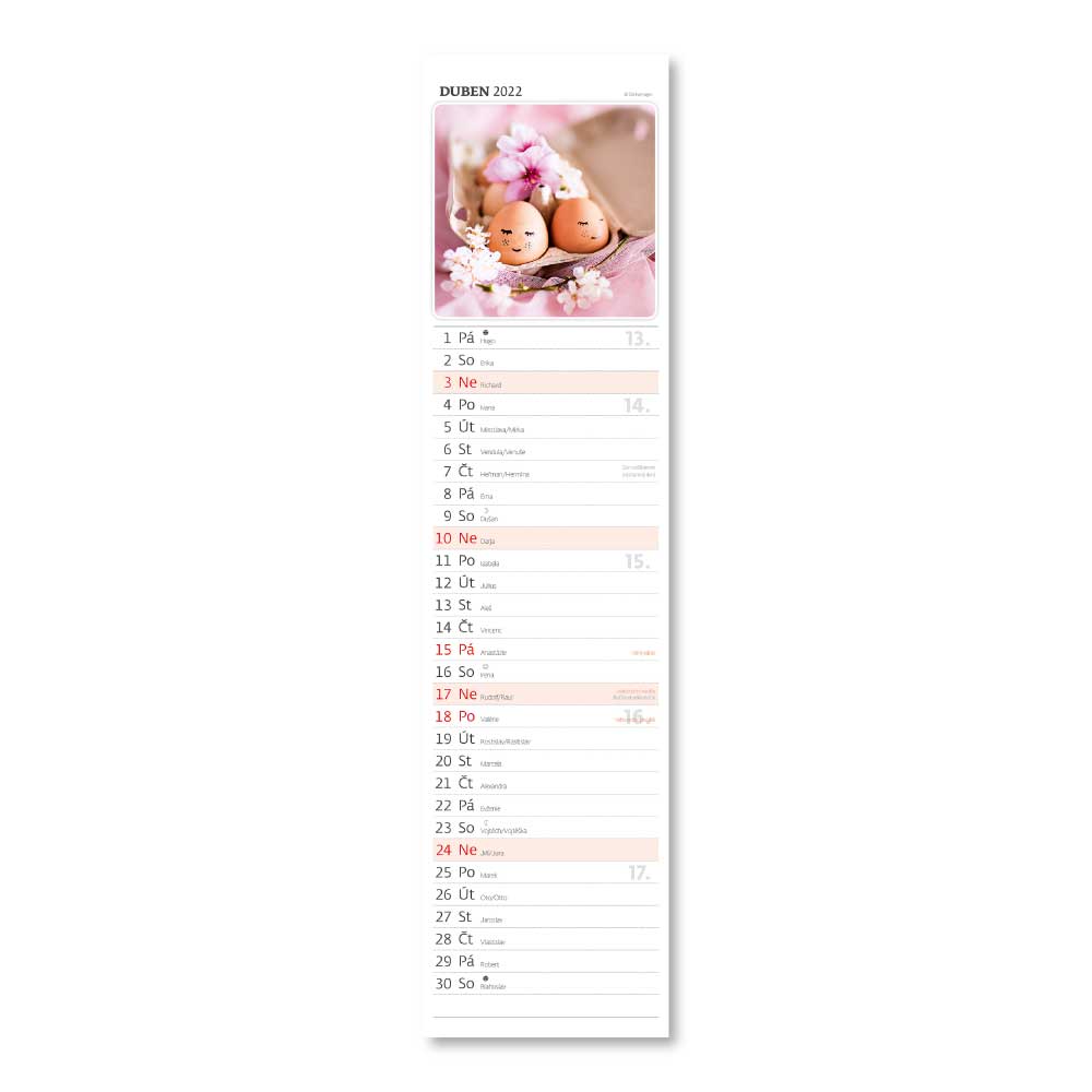 Rozmer: 12 x 48 cm Kalendárium: české mesačné s menami Rozsah kalendára: 13 listov Väzba: Twin wire