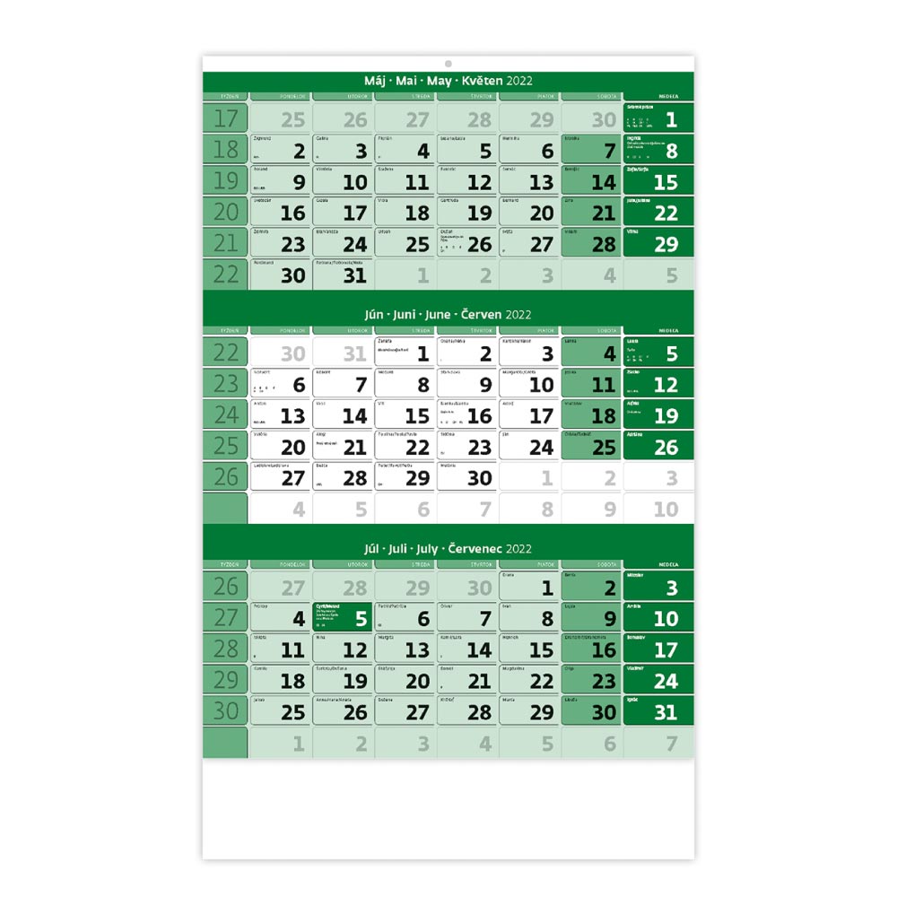 Rozmer: 31,5 x 45 cm Kalendárium: slovenské trojmesačné menné se sviatky vybraných európskych štátov Rozsah kalendára: 12 listov Plocha pre potlač spodná: 31,5 x 7 cm Plocha pre potlač horná laš: 31,5 x 18 cm