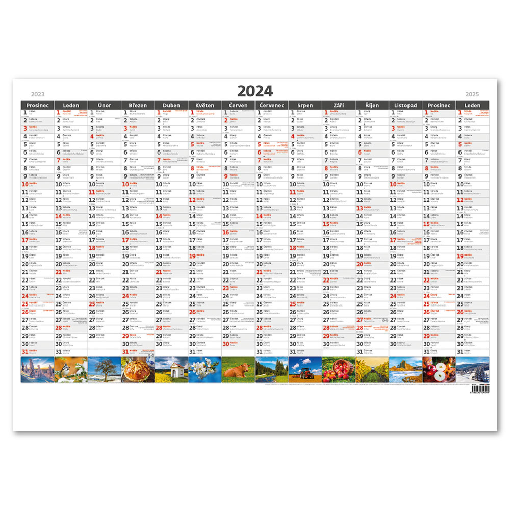 Rozmer: 88 x 64 cm Kalendárium: české ročné menné Rozsah kalendara: 1 list Plocha pre potlač: 88 x 7 cm