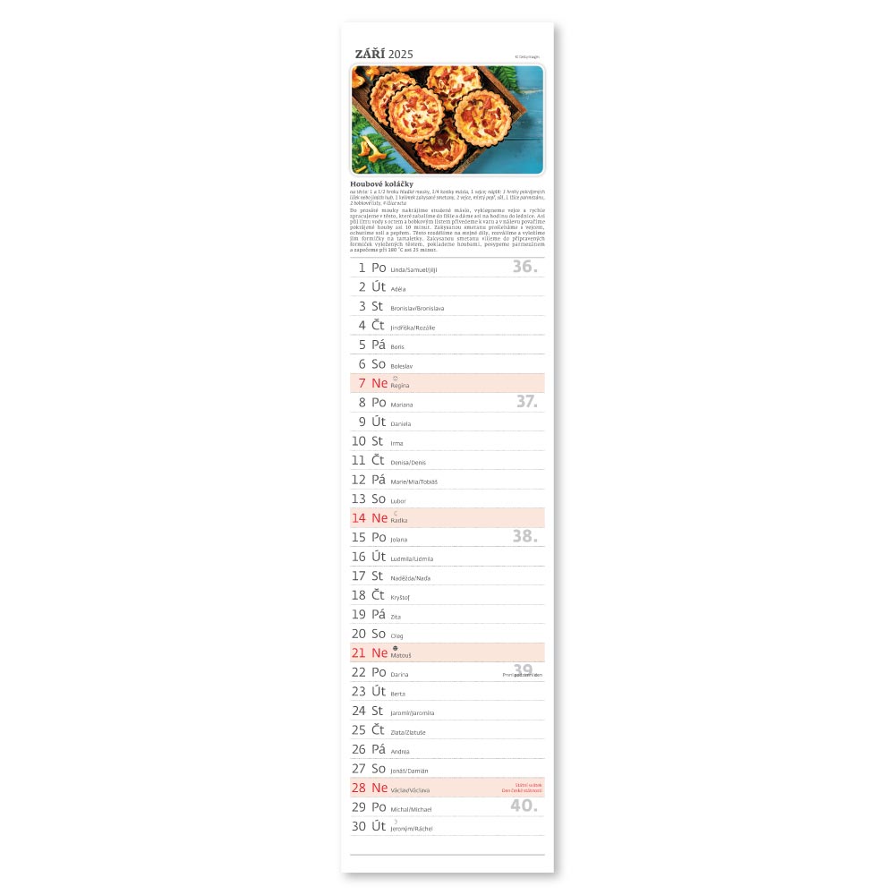 Rozmer: 12 x 48 cm Kalendárium: české mesačné s menami Rozsah kalendára: 13 listov Väzba: Twin wire