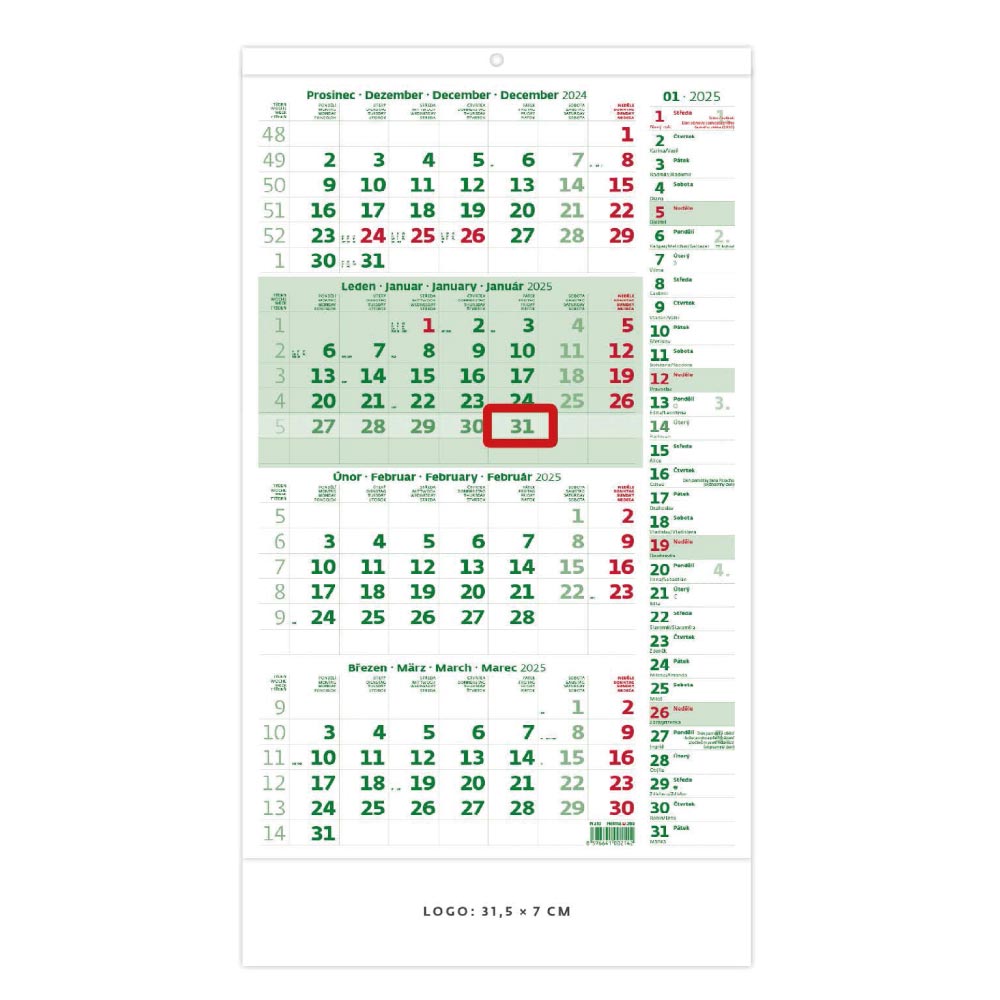 Rozmer: 31,5 x 49 cm Zložený formát: 31,5 x 18,5 cm Kalendárium: CZ 4mesačné menné so sviatkami vybraných európskych štátov Rozsah kalendára: 4 x 12 listov Plocha pre potlač: 31,5 x 3,5 cm (plochy medzi miesacmi) 31,5 x 18 cm (horná plocha)