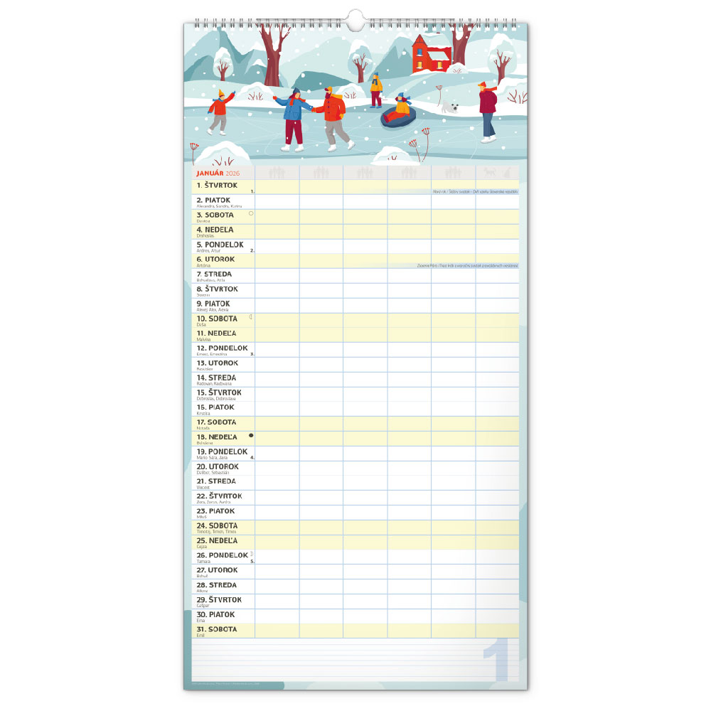 Rozmer: 33 x 64 cmKalendárium: slovenskéRozsah kalendára: 14 stránVäzba: dvojitá špirála