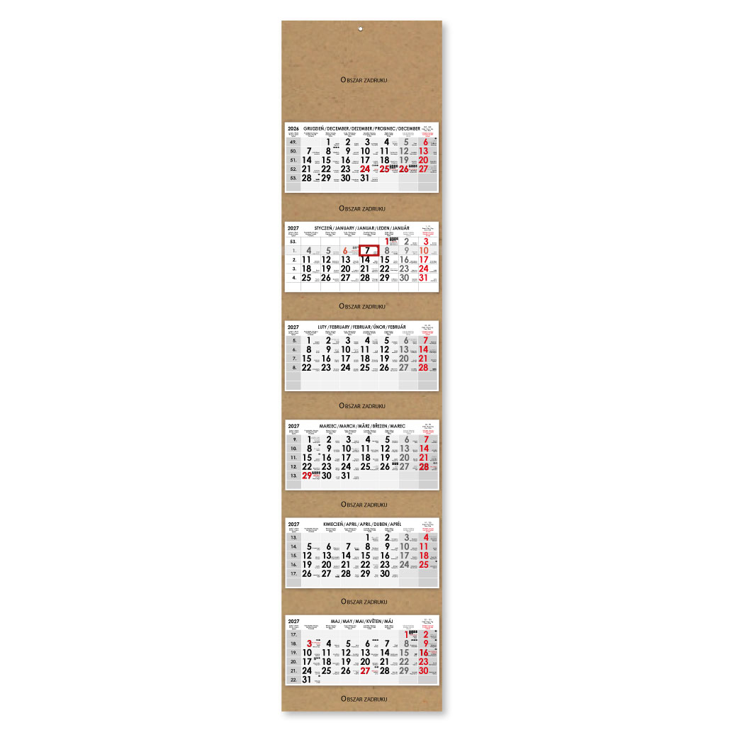 Rozsah: 6 x 12 listov Kalendárium: šesťmesačné polské menné s jazykovou mutáciou (PL, ANG, D, CZ, SK) Medzinárodné sviatky: PL, CZ, SK, A, D, H, GB, E, F, I, UA Formát kalendária: 295 x 135 mm Formát kalendára bez potlače: - rozložený: 297 x 1260 mm - z