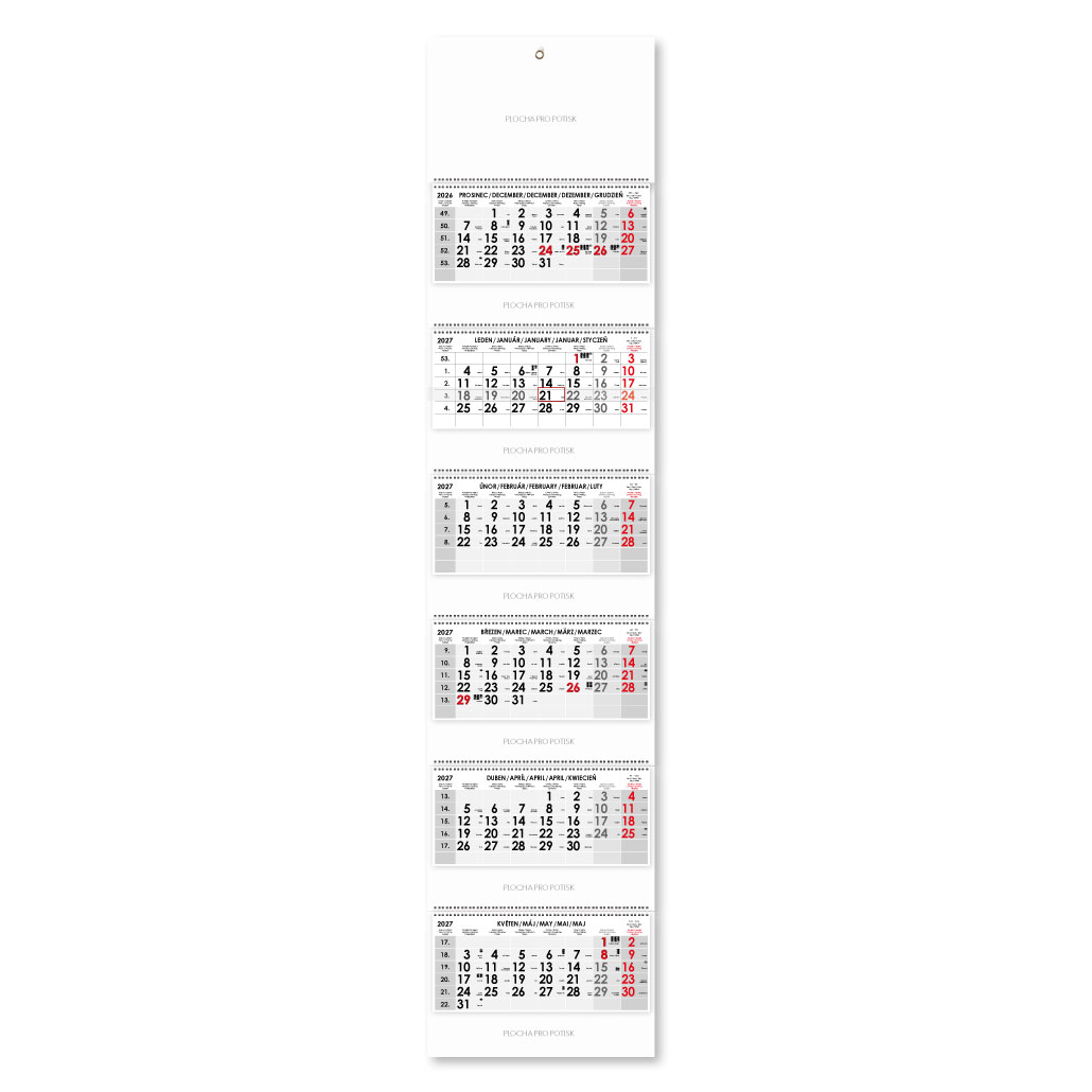 Rozsah: 6 x 12 listov Kalendárium: šesťmesačné české menné s jazykovou mutáciou SK, CZ, ANG, D, PL Medzinárodné sviatky: CZ, SK, PL, A, D, H, GB, E, F, I Formát kalendária: 295 x 135 mm Formát kalendára bez potlače: - rozložený: 297 x 1295 mm - zl