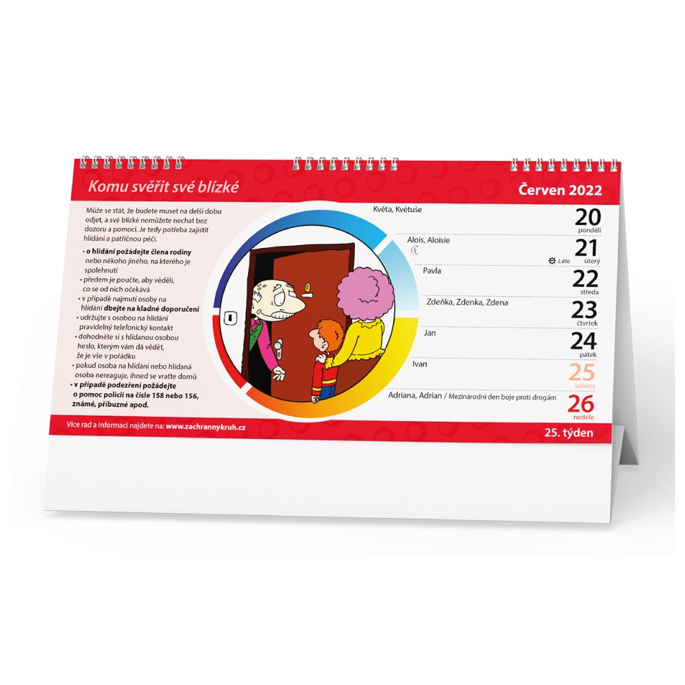 Rozmer: 300 x 150 mm Kalendárium: české týždenné menné Rozsah kalendára: 60 strán Väzba: delená kovová špirála Twin Wire Stojanček: áčkový Papier: kriedový papier povrchovo upravený UV lakom proti oteru Plocha pre potlač: 300 x 35 mm Obsahuje: Š