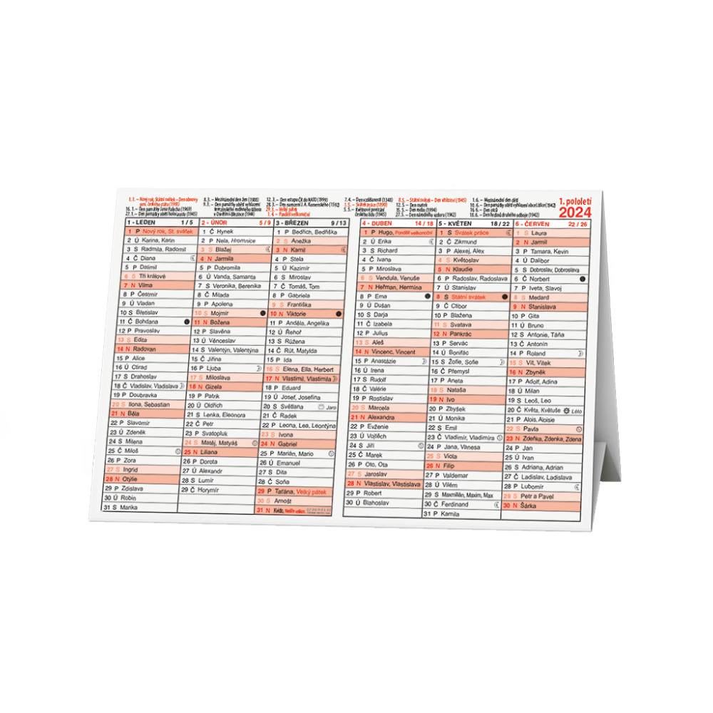 Rozmer: 210 x 140 mm Kalendárium: české půlroční jmenné kalendárium Rozsah kalendára: 2 strány Obsahuje mesačné fázy, ročné obdobia, letný a zimný čas.