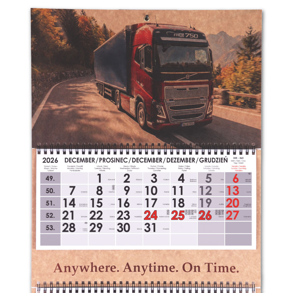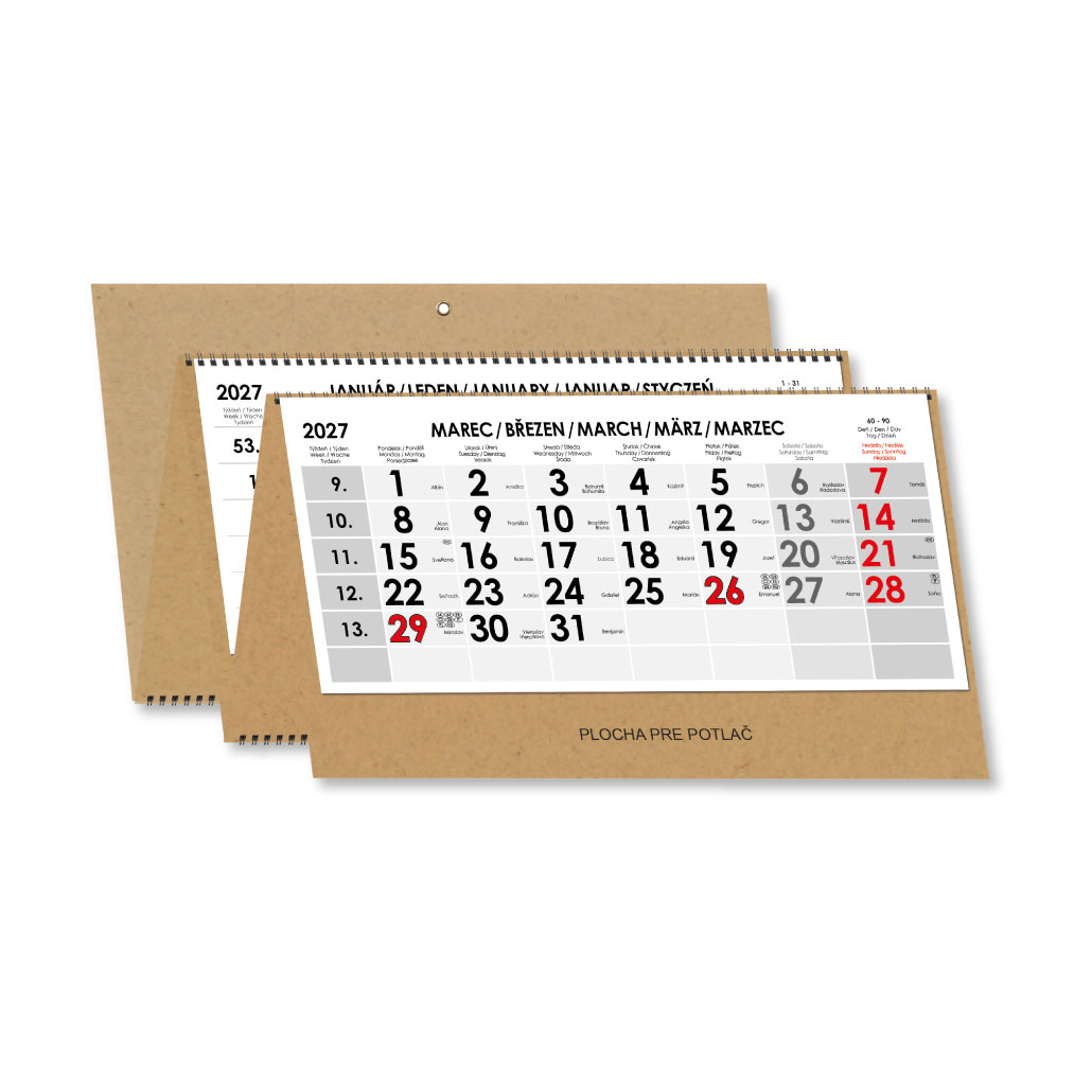 Rozsah: 4 x 12 listov Kalendárium: štvormesačné slovenské menné s jazykovou mutáciou CZ, ANG, D, PL Medzinárodné sviatky: SK, CZ, PL, A, D, H, GB, E, F, I Formát kalendária: 295 x 135 mm Formát kalendára bez potlače: - rozložený: 297 x 925 mm - zl