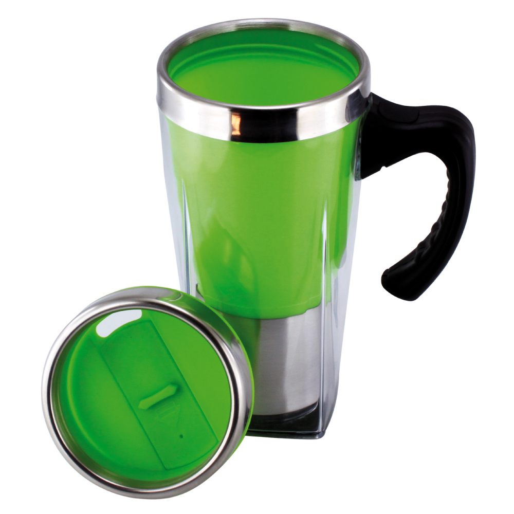 dvojplášťový termohrnček s vekom z nerezu a plastu