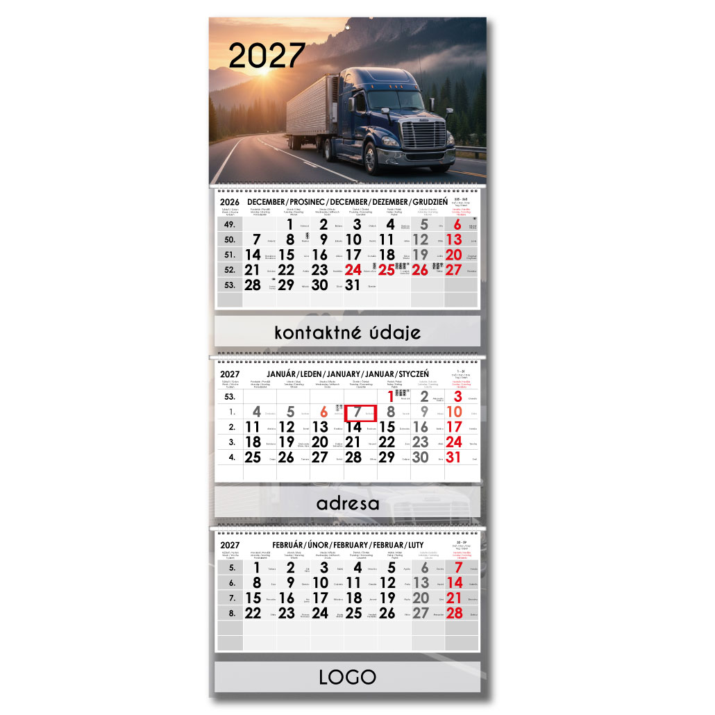 Rozsah: 3 x 12 listov Kalendárium: trojmesačné slovenské menné s jazykovou mutáciou CZ, ANG, D, PL Medzinárodné sviatky: SK, CZ, PL, A, D, H, GB, E, F, I Formát kalendária: 295 x 135 mm Formát kalendára bez potlače: - rozložený: 297 x 740 mm - zlo