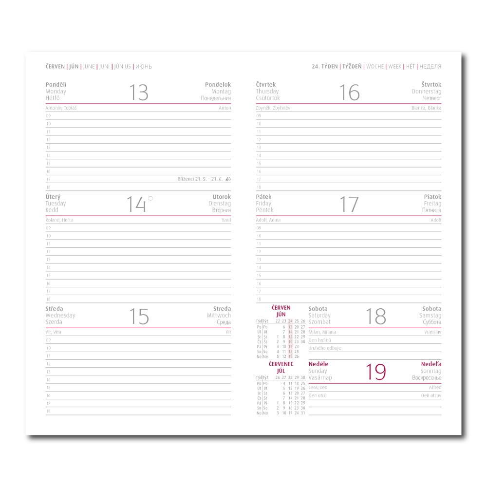 Rozmer: 9 x 15 cm Formát: vreckový Kalendárium: 6jazyčné týždenné od decembra 2021 (CZ, SK, GB, DE, HU, RU) Počet strán: 128 strán Poťahový materiál: matná koženka s jemnou štruktúrou Väzba: tuhá knižná Farba bloku: biela Diár obsahuje: miesto pr