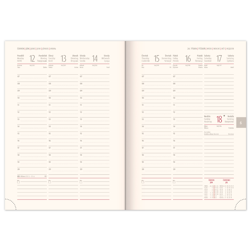 Rozmer: 15 x 21 cm Formát: A5 Kalendárium: 6jazyčné týždenné od decembra 2021 (CZ, SK, GB, DE, HU, RU) Počet strán: 144 strán Poťahový materiál: matný povrch s metalickou štruktúrou Väzba: tuhá knižná Farba bloku: krémová Diár obsahuje: miesto pr