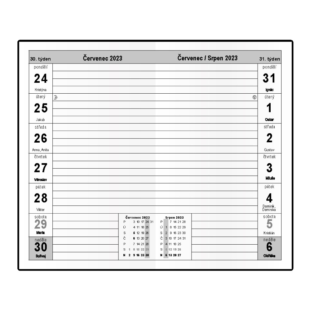 Rozmer: 90 x 150 mm Formát: vreckový Kalendárium: týždenné české menné Poťahový materiál: jemný hladký materiál PVC Papier: biely Počet strán: 72 Väzba: šitá väzba V1 Kalendárium obsahuje: mesačné fázy, ročné obdobia, letný a zimný čas, tabuľko