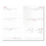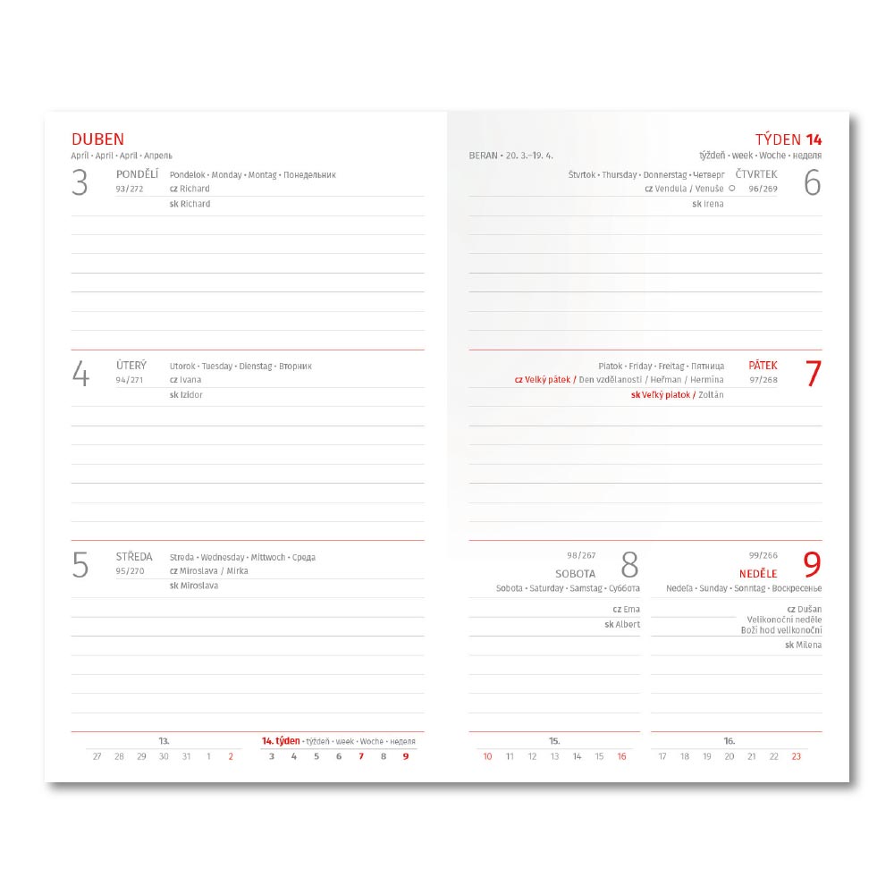 Rozmer: 90 x 150 mm Formát: vreckový Kalendárium: české týždenné Rozsah: 144 strán Papier: biely Materiál dosiek: lesklá koženka Hlavný jazyk: čeština Ďalšie jazyky: SK, EN, DE, RU Infostrany obsahujú: plánovací kalendár, CZ/SK krstné mená, roč