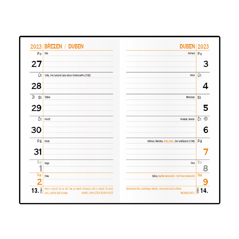 Rozmer: 90 x 150 mm Formát: vreckový Kalendárium: české týždenné menné kalendárium školske (september 2022 - august 2023) Poťahový materiál: matné lamino s tlačenou grafikou Papier: biely Počet strán: 72 Väzba: šitá väzba V1 Kalendárium obsahuje: