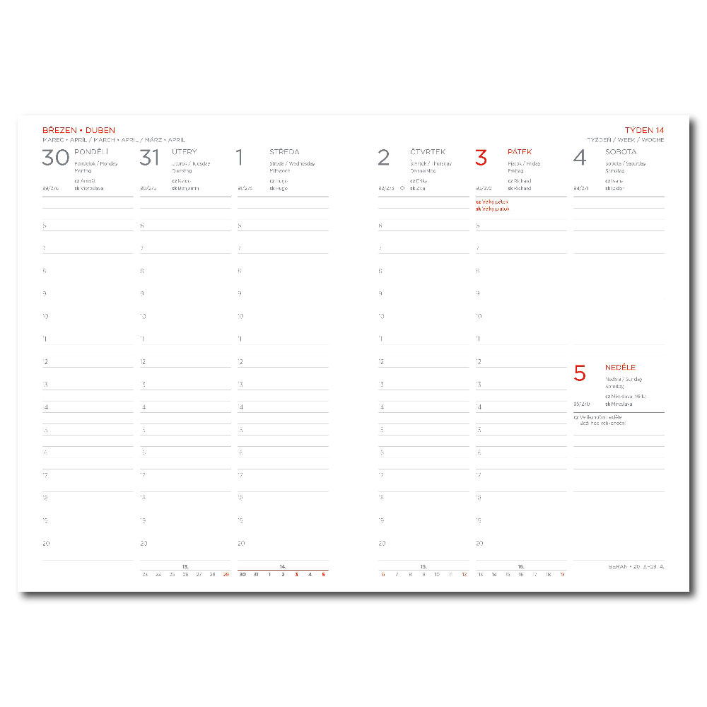 Rozmer: 148 x 210 mm Formát: A5 Kalendárium: české týždenné Rozsah: 128 strán Papier: biely Materiál dosiek: balacron Hlavný jazyk: český Ďalšie jazyky: SK, EN, DE Infostrany obsahujú: CZ/SK krstné mená, štátne sviatky CZ/SK, Mesačný plánovač 2026 Słowac