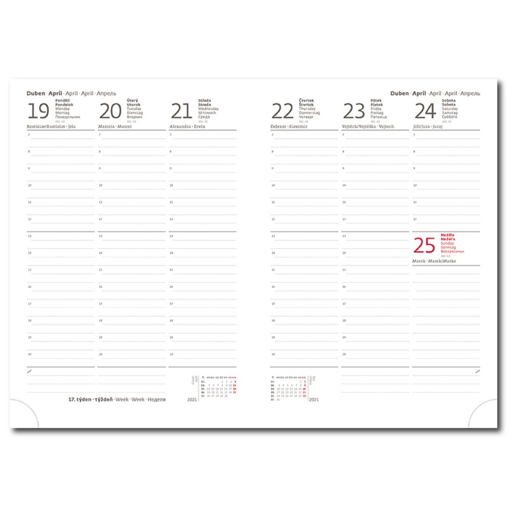 Rozmer: 143 x 205 mm Formát: A5 Kalendárium: týždenné české/slovenské Počet strán: 128 Farba bloku: biela Väzba: V8 Poťahový materiál: matná koženka Obsahuje: osobné údaje, plánovač dovolenky (mesačný prehľad), plánovací kalendár, telefónne pred