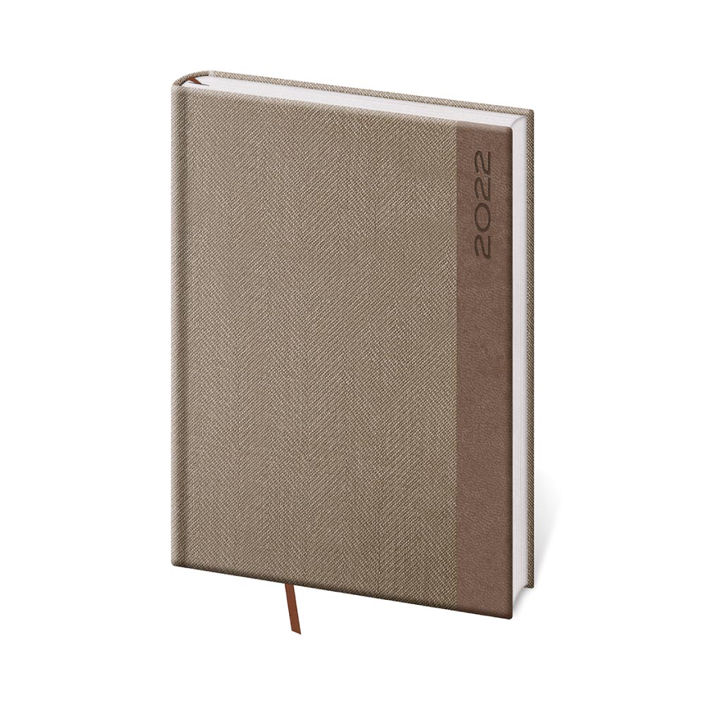 Rozmer: 143 x 205 mm Formát: A5 Kalendárium: týždenné české/slovenské Počet strán: 128 Farba bloku: biela Väzba: V8 Poťahový materiál: matná koženka so štruktúrou textilu Obsahuje: osobné údaje, plánovač dovolenky (mesačný prehľad), plánovací ka