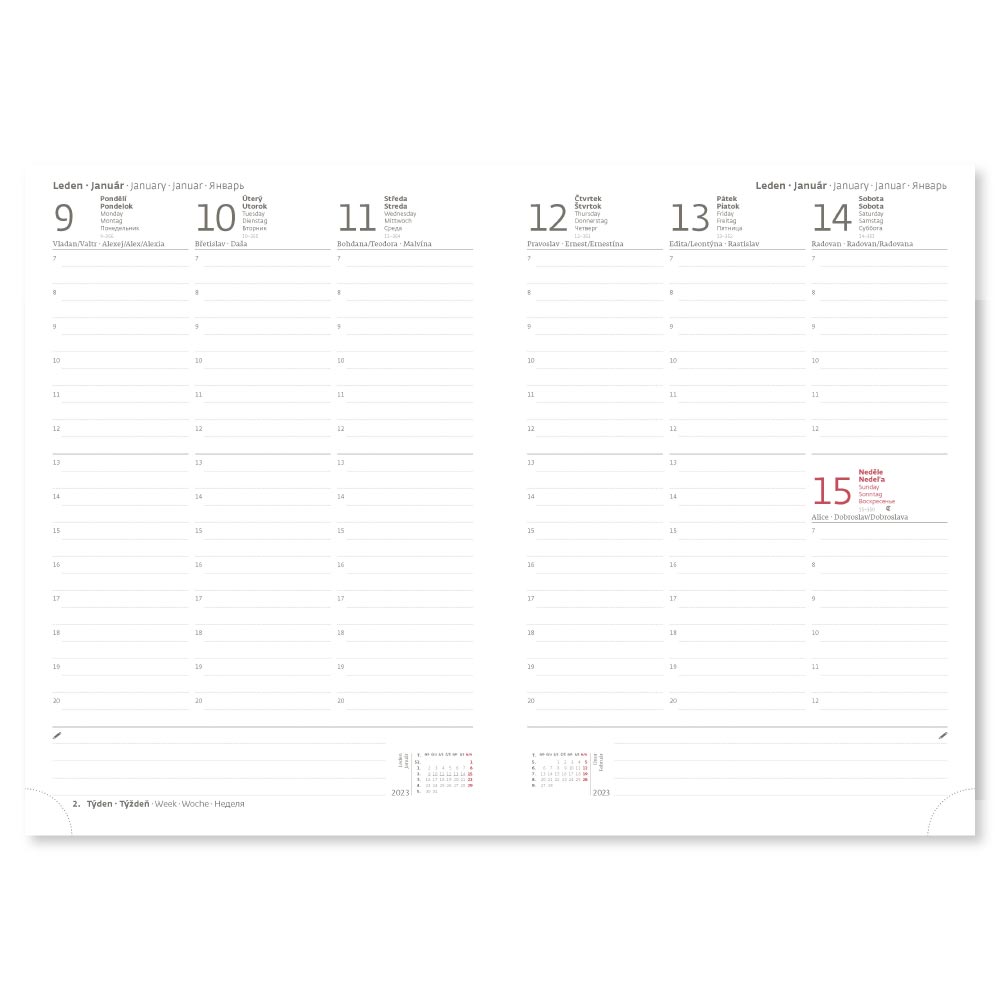Rozmer: 170 x 240 mm Formát: B5 Kalendárium: týždenné české/slovenské Počet strán: 128 Farba bloku: biela Väzba: V8 Poťahový materiál: matná koženka Obsahuje: osobné údaje, plánovač dovolenky (mesačný prehľad), plánovací kalendár, telefónne pred