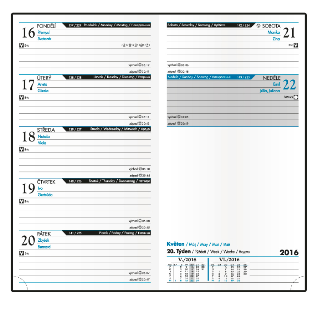 Kalendárium - týždenné české a slovenské menné, dni a mesiace ve 5 jazykoch: CZ, SK, ANG, D, RU