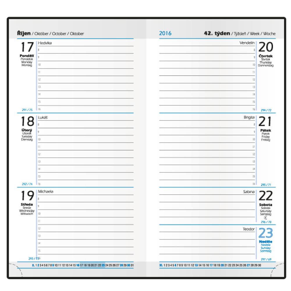 Kalendárium - týdenné české menné, dni a mesiace ve 4 jazykoch: CZ, SK, ANG, D,