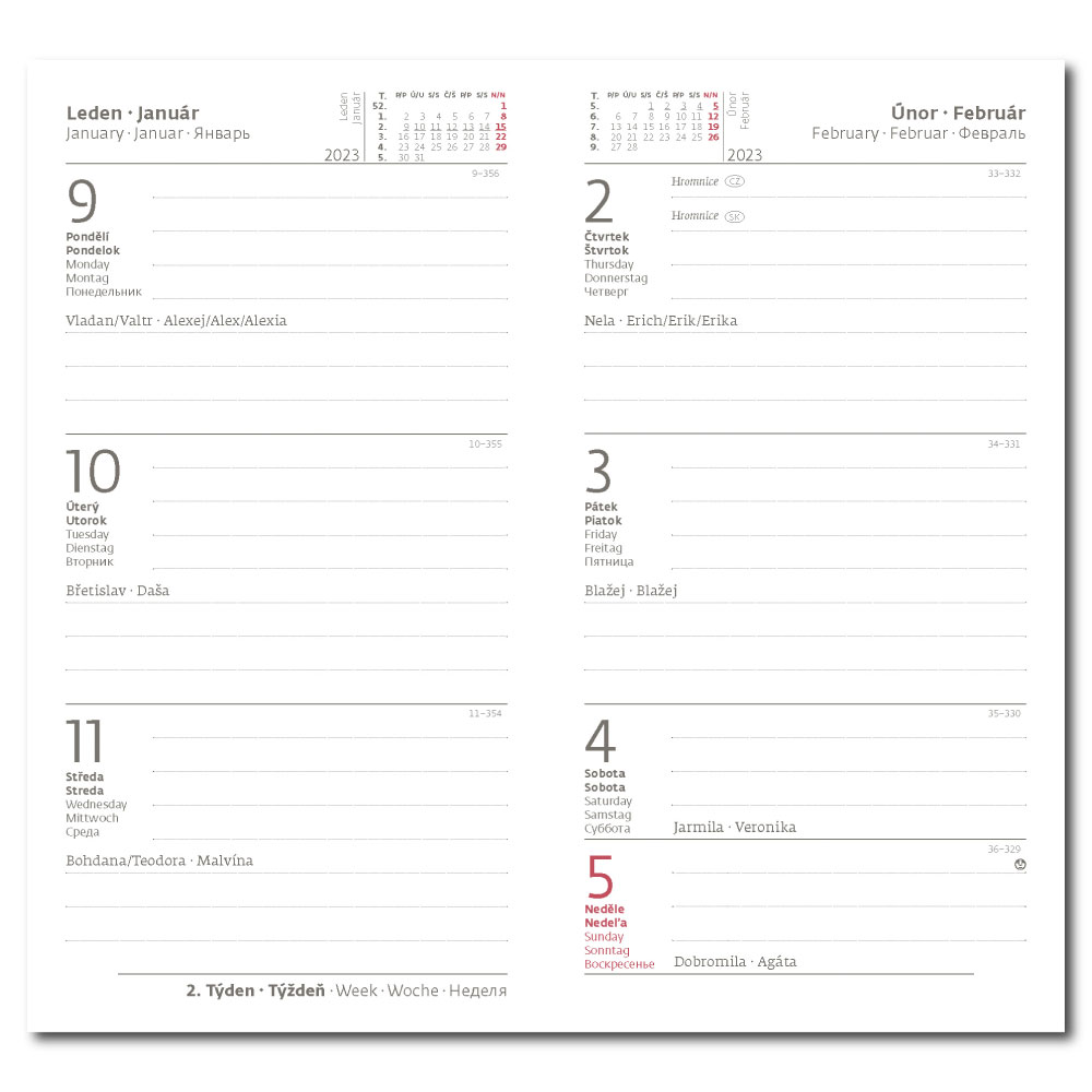 Rozmer: 80 x 150 mm Formát: vreckový Kalendárium: týždenné české/slovenské Počet strán: 128 Farba bloku: biela Väzba: V8 Poťahový materiál: lesklá hladká koženka Obsahuje: osobné údaje, plánovač dovolenky (mesačný prehľad), plánovací kalendár, t