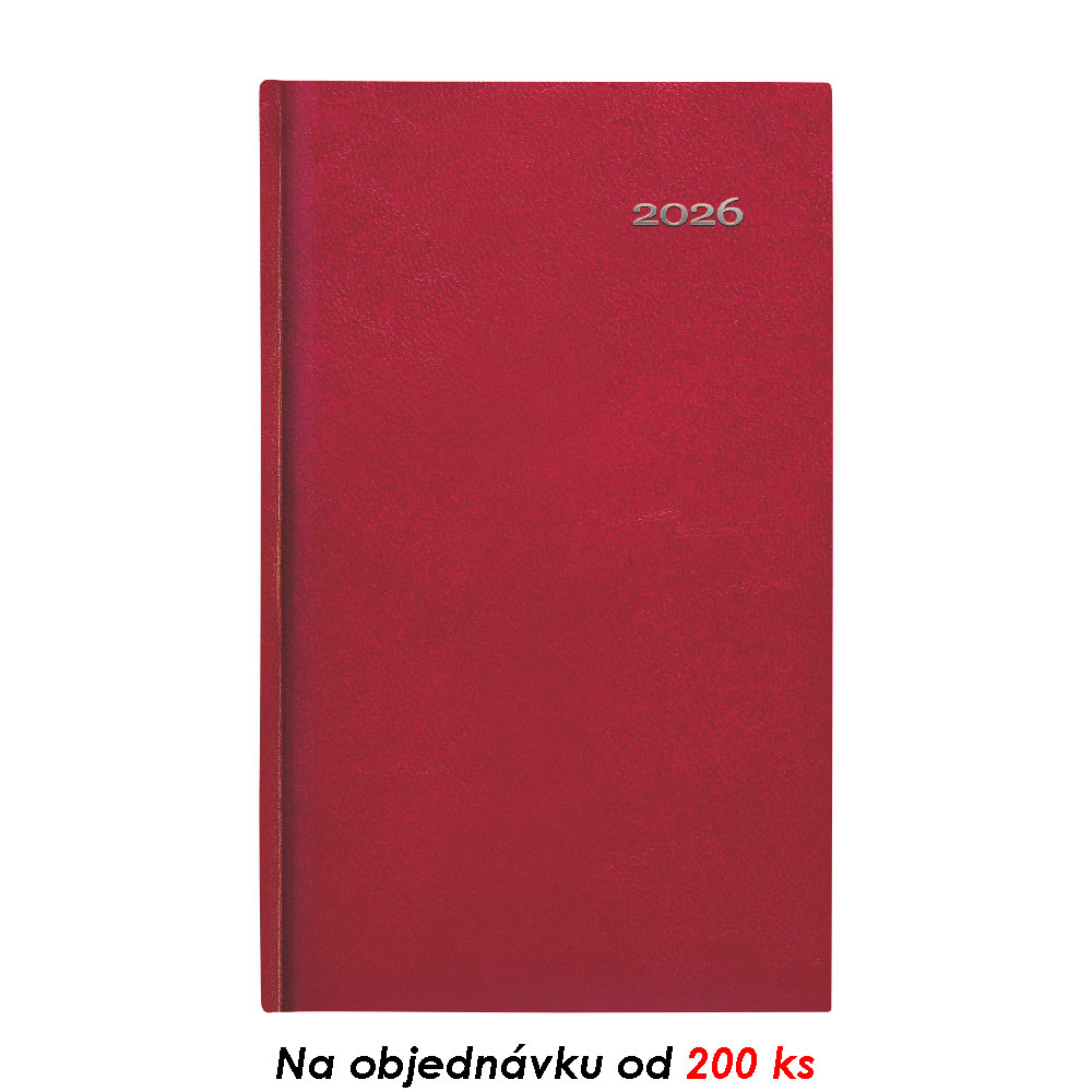 Rozmer: 90 x 150 mm Formát: vreckový Kalendárium: české týždenné Rozsah: 128 strán Papier: biely Materiál dosiek: balacron Hlavný jazyk: český Ďalšie jazyky: SK, EN, DE Na objednávku od 200 ks Infostrany obsahujú: CZ/SK krstné mená, štátne sviatky CZ/SK,