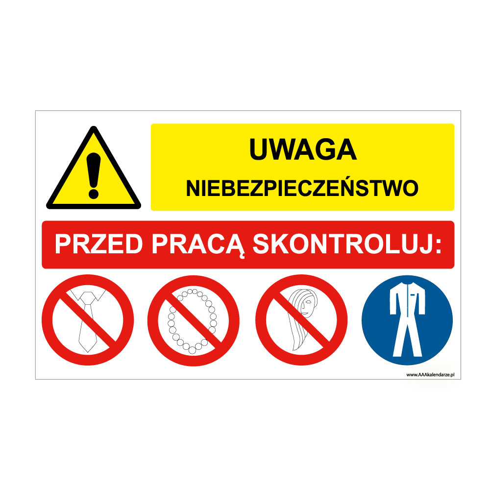UWAGA NIEBEZPIECZEŃSTWO - PRZED PRACĄ SKONTROLUJ, ZNAK ŁĄCZONY, płyta PVC 1 mm, 95x60 mm