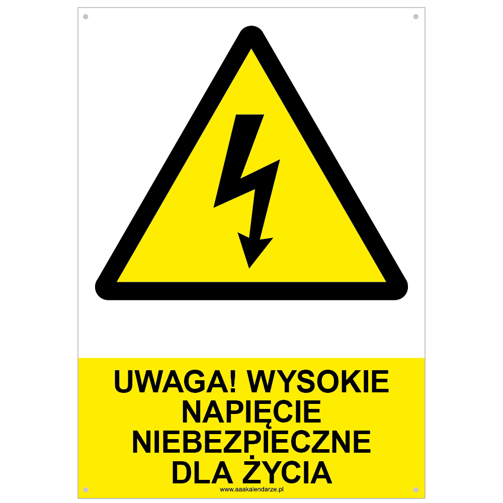 UWAGA! WYSOKIE NAPIĘCIE NIEBEZPIECZNE DLA ŻYCIA - znak BHP z dziurkami, płyta PVC A4, 2 mm