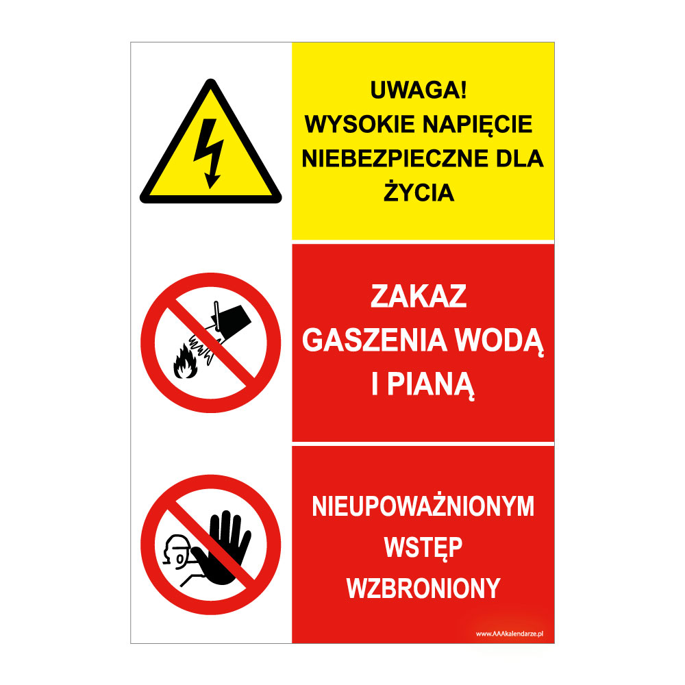 UWAGA! WYSOKIE NAPIĘCIE...- ZAKAZ GASZENIA WODĄ I PIANĄ - NIEUPOWAŻNIONYM WSTĘP…, naklejka 210x297 mm