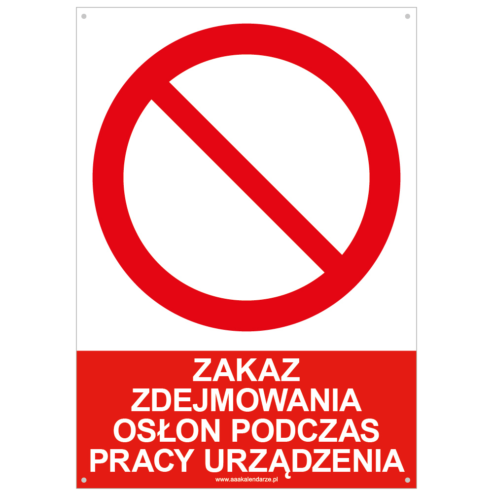 ZAKAZ ZDEJMOWANIA OSŁON PODCZAS PRACY URZĄDZENIA - znak BHP z dziurkami, płyta PVC A5, 2 mm